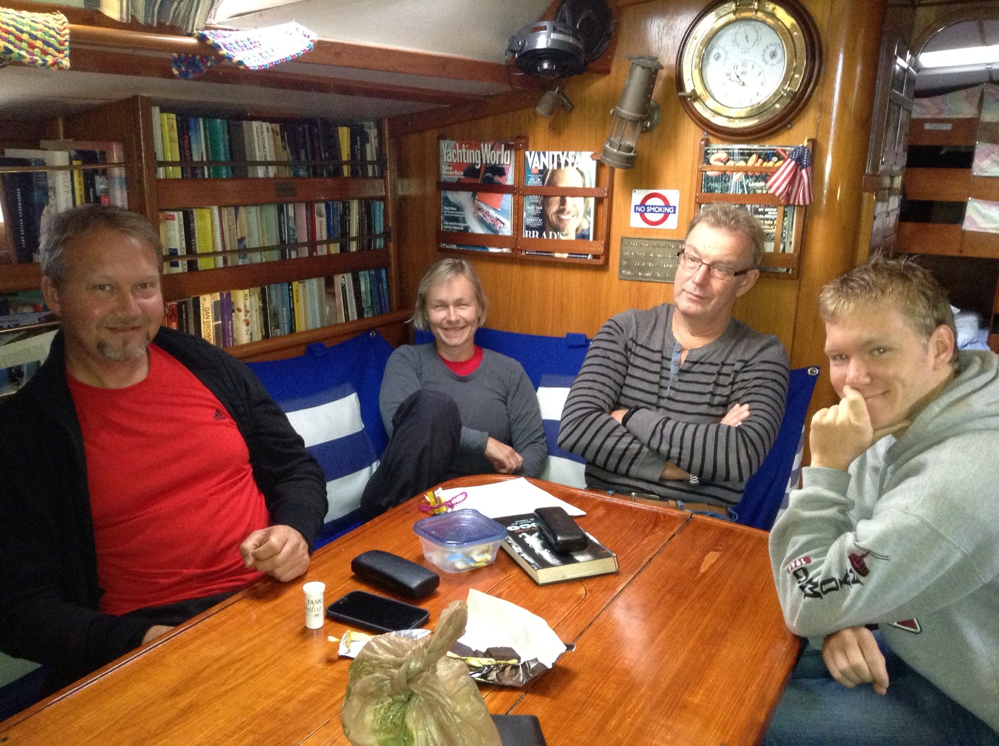På kvällen bunkring tillsammans med nya besättningen. Skepparens tandläkare och nära vän Janne, Ingrid och Ludvig från Öckerö och Bobby (Robert) från North Carolina. Så nu blir det mycket svengelska ombord.