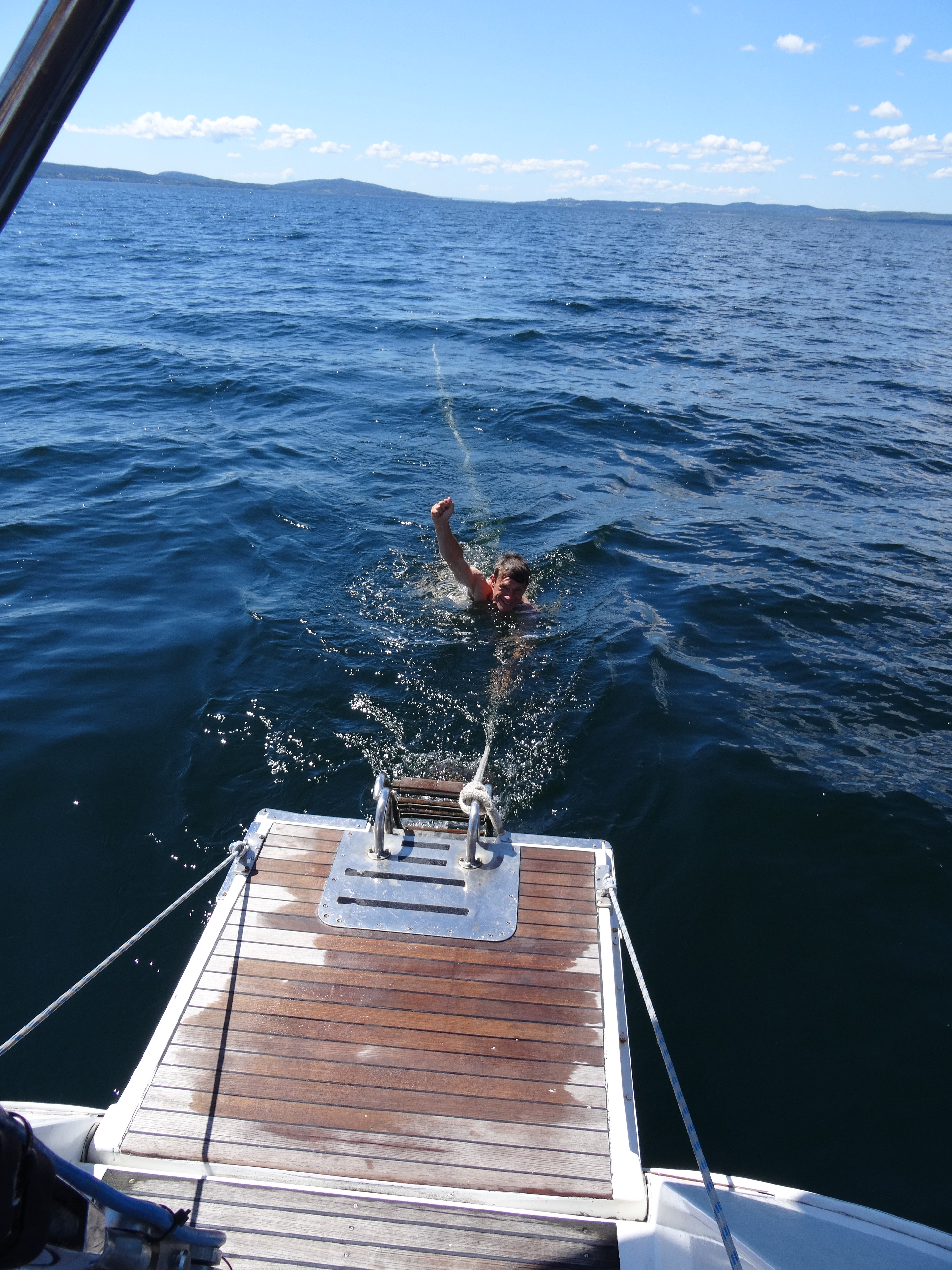 7-9 augusti: Än så länge känns Grönland långt borta. Skepparen väckte oss i St Peter genom att starta motorn och lägga loss medan vi långsamt med kaffekoppen i hand masade oss upp. I sol och stilla läns med genackern (genua i spinnakertyg) gled vi längs sjösystemet D Ór på Breton Island norr om Nova Scotia. Badade från båten i 22-gradigt vatten. Vi funderade på om bilden av tuffa äventyrare, som vi hemma försökt sprida om oss, inte riktigt stämde med verkligheten. Men vi får väl se senare när isbergen börjar dyka upp i nästa vecka. Nu hade vi cirka två dygns gång framför oss till Newfoundland och en knapp bris krusade havet i kvällsolen. När natten kommit passerade vi inloppet till St Lawrence och Quebec. Nästföljande dag blandade vi segling och motorgång bland nyfikna delfiner och enstaka valar. Var vi vekligen på väg norrut eller hade skepparen vänt skeppet tillbaka till Karibien? Men Newfoundlands höga klippor visade dock att vi var på rätt väg. Ett snabbgående fartyg som inte syntes på AIS (autmatic identification system) styrde upp mot oss. Det var polisen som undrade vilka vi var. Under natten hördes ödesmättade May day anrop, lite kusligt. Nästa morgon regnade det faktiskt och eftersom väderrapporten utlovar 20 sekundmeter och regn har vi nu angjort i en skyddad fjord, Bonne Bay, på Newfoundlands västkust. Lunch i byn och vandring i sol upp i bergen och makalös utsikt över fjorden avslutade dagen. Ännu inget oväder. Per vid tangenterna.