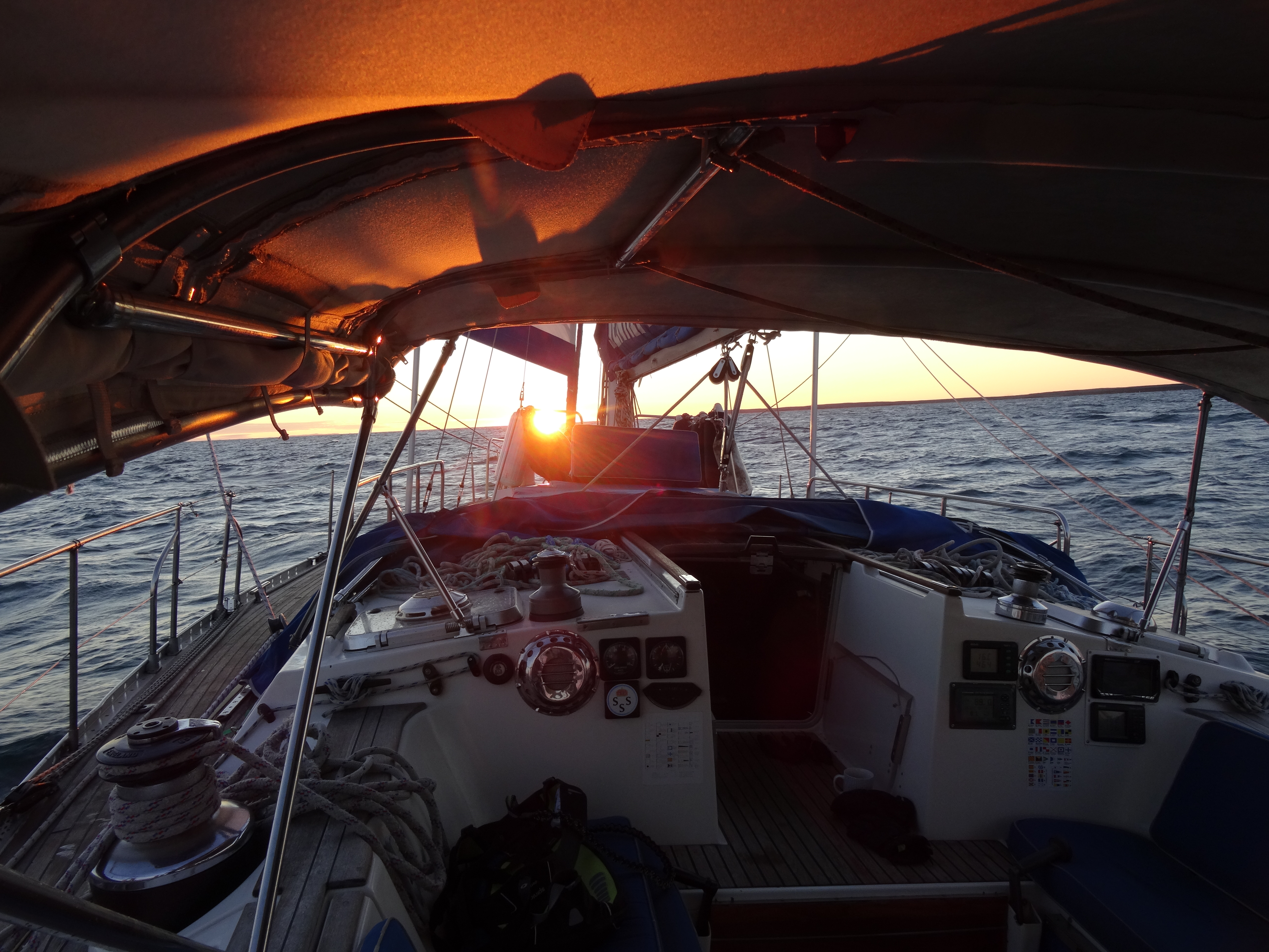 13 AugNu har vi seglat i 26 timmar och 176 sjömil för att komma till sista anhalten på Newfoundland innan det bär av till Grönland. Vi har seglat för en undanvind som var ”kulingstark” och vågorna höga men besättningen kör sina 3 timmarspass dygnet runt. PO och Dallas styrde båten mellan kl 18 och 21 och det guppade fint i vågorna. Det märks att Jennifer har god erfarenhet av vågor och kuling. Vi seglar båten två och två och när det är ”svettigt” att hålla båten på rätt kurs är det lagom att styra i 30 minuterspass. När PO och jag (Dallas) styrt i 3 timmar var det dags för Anki och Ingmar att ta över ratten och när klockan var 03 (imorse) hade Paula och Per gjort sitt pass. När jag kröp ur kojen kändes det att vågorna minskat och havet var lugnare. Och så fick vi njuta av soluppgången!!!