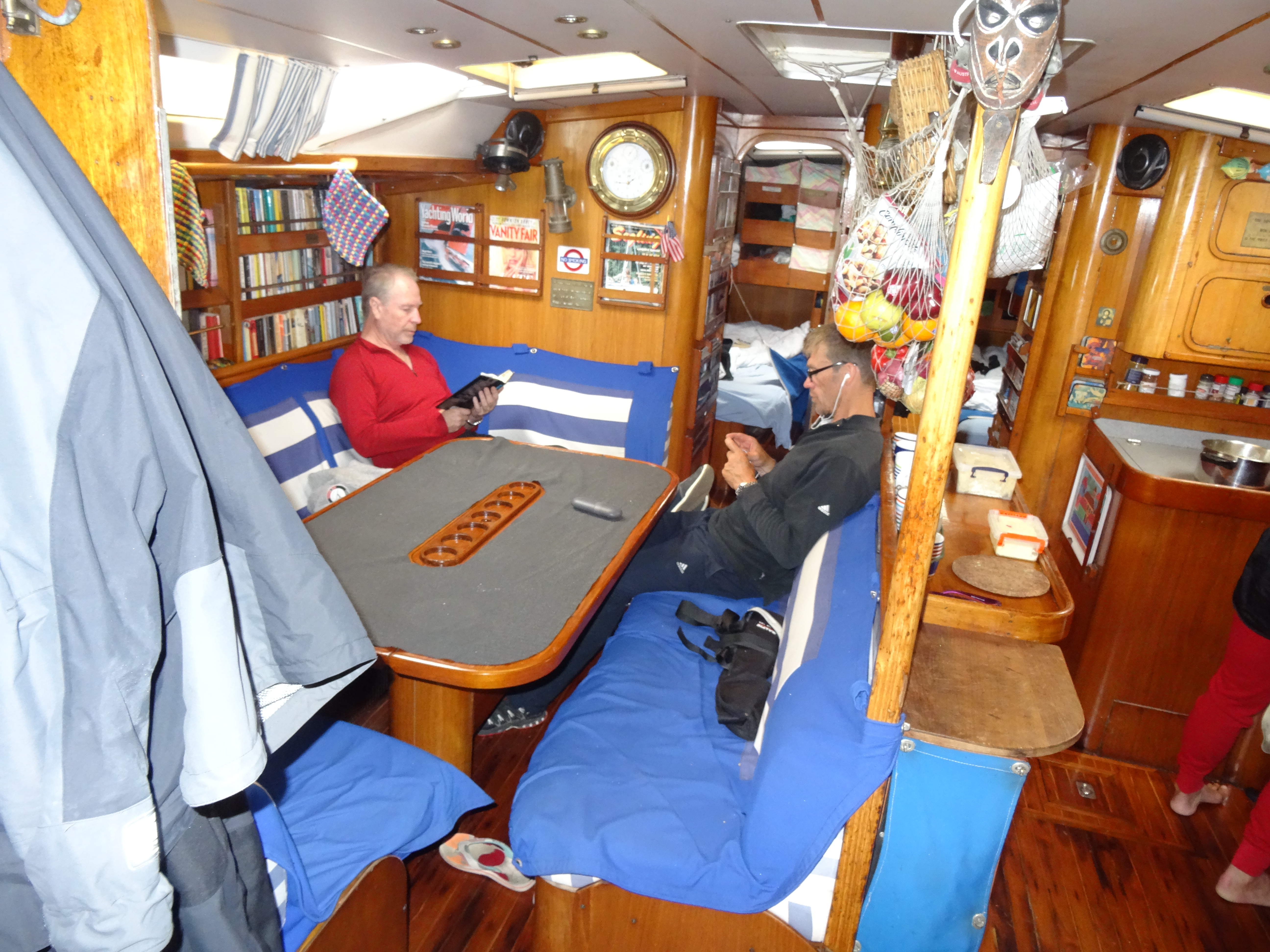 På sin frivakt sover man mest, läser, tittar på film, lagar och äter mat. Vardagslivet är långt borta. Hittills har vi sett en båt på 5 dygn. Delfiner och fåglar ser vi regelbundet annars är vi helt ensamma. Ett dygn med kuling och stora vågor som bromsade oss i början. Efter det har vi mest haft snälla och undanvindar.