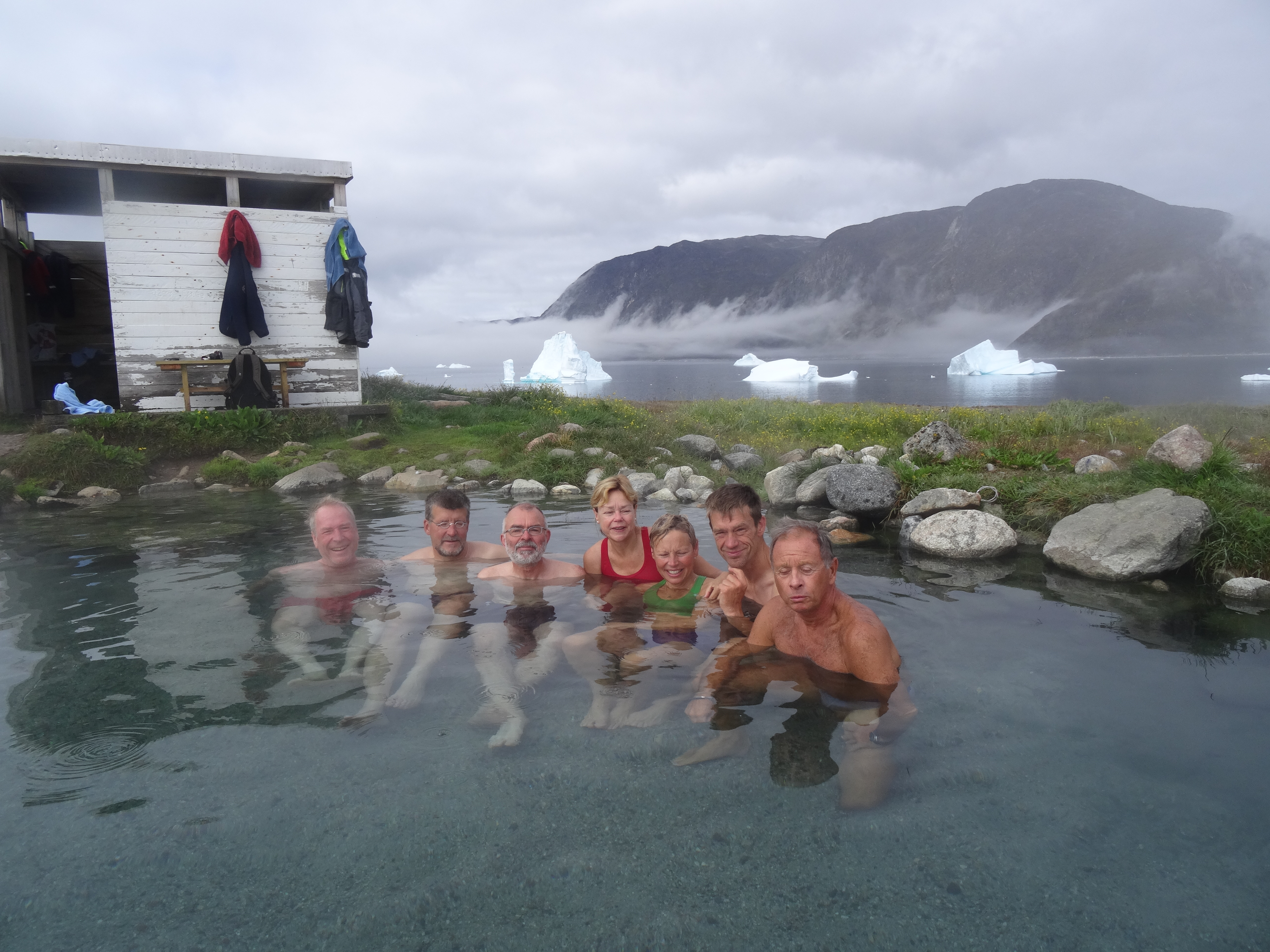 Genom dimma och isbergsrally tog vi oss till ön Unarfoq med varma källor. En liten hund låg bredvid som isbjörnsvakt…